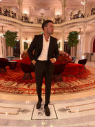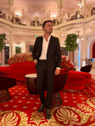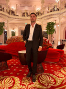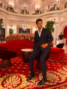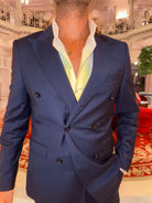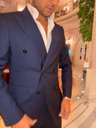 Abito doppio petto, petto Lancia impunturato con bottoni tinta su tinta, possiede un fit slim ed elegante