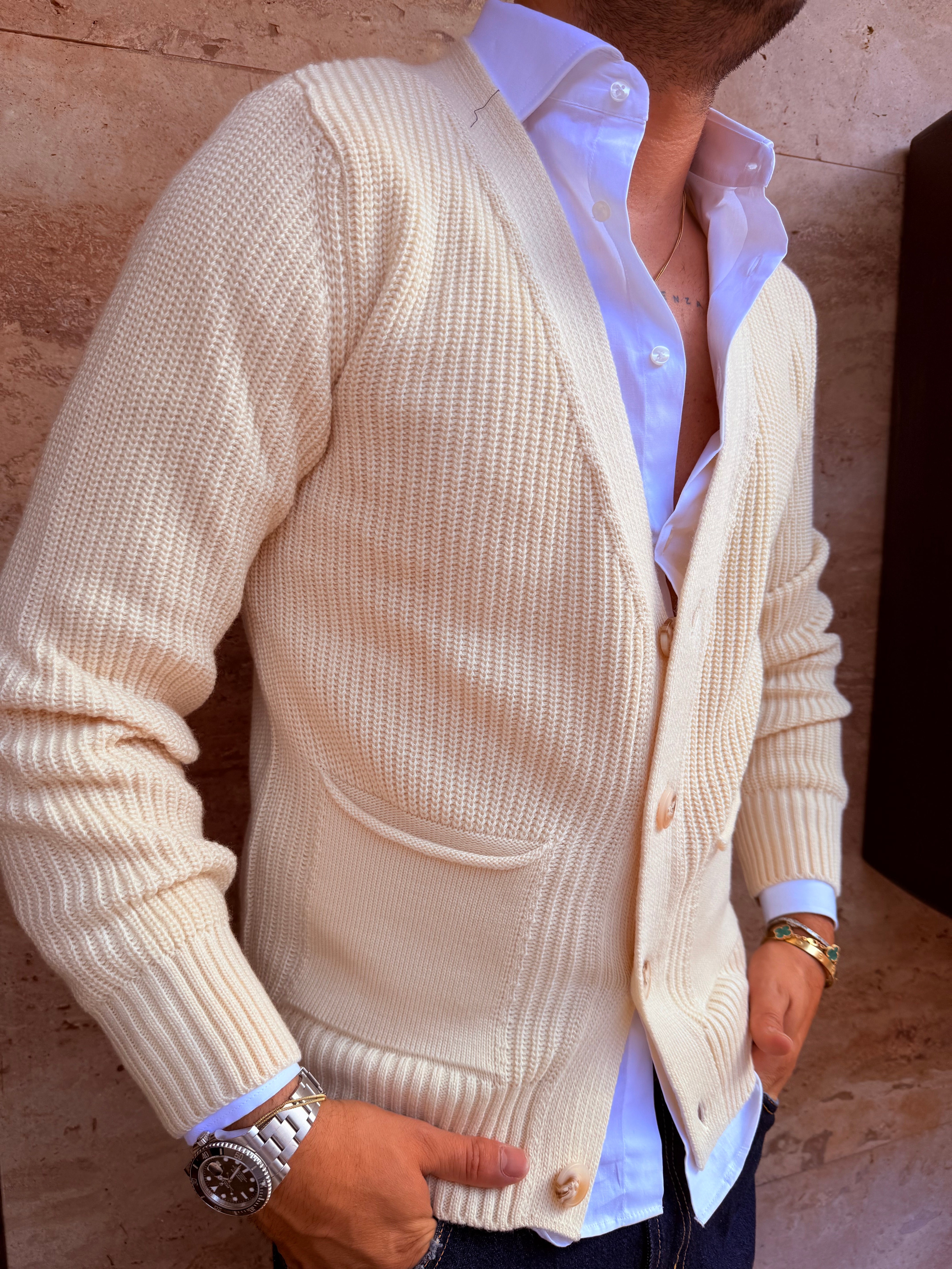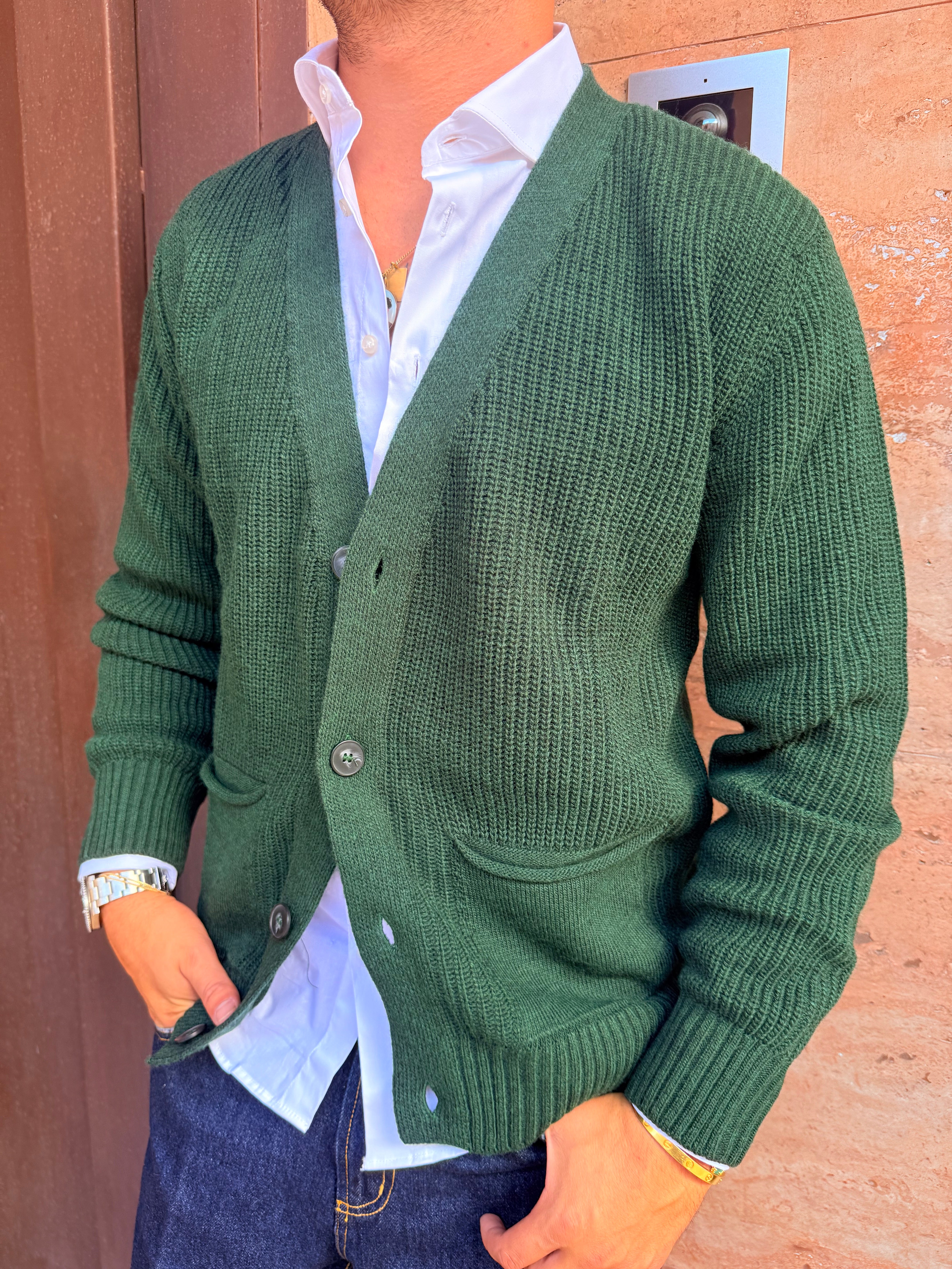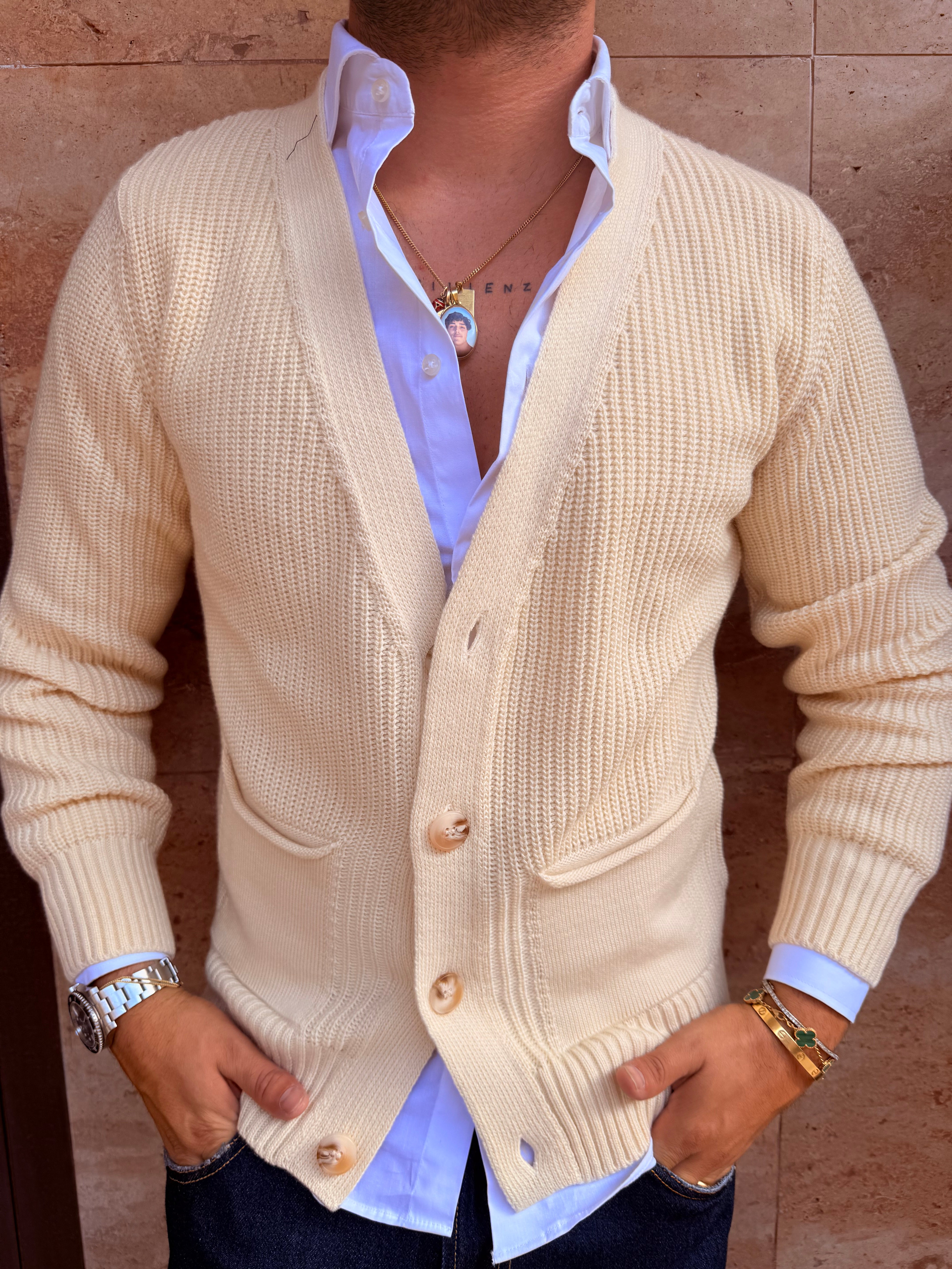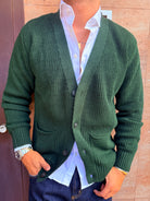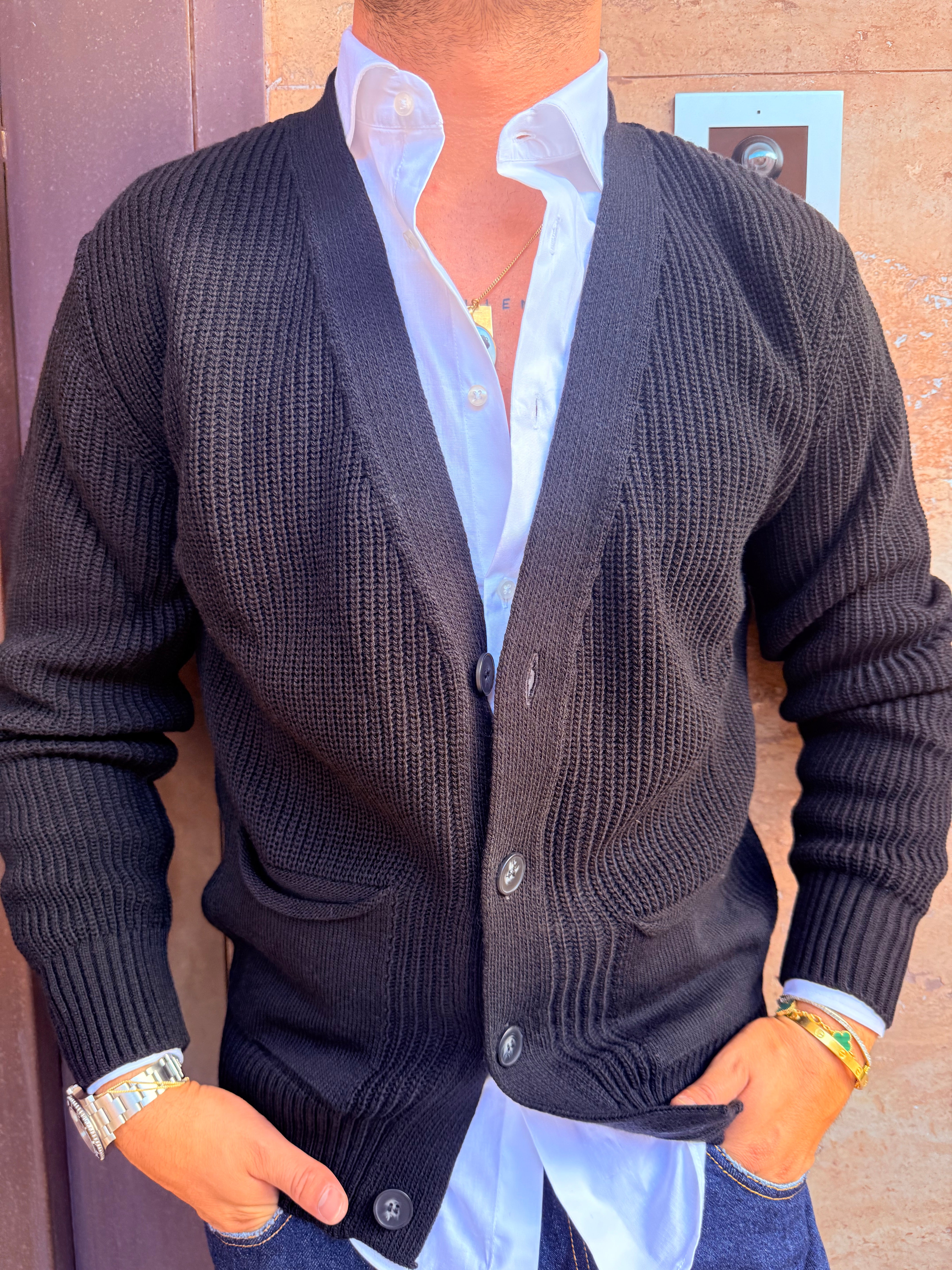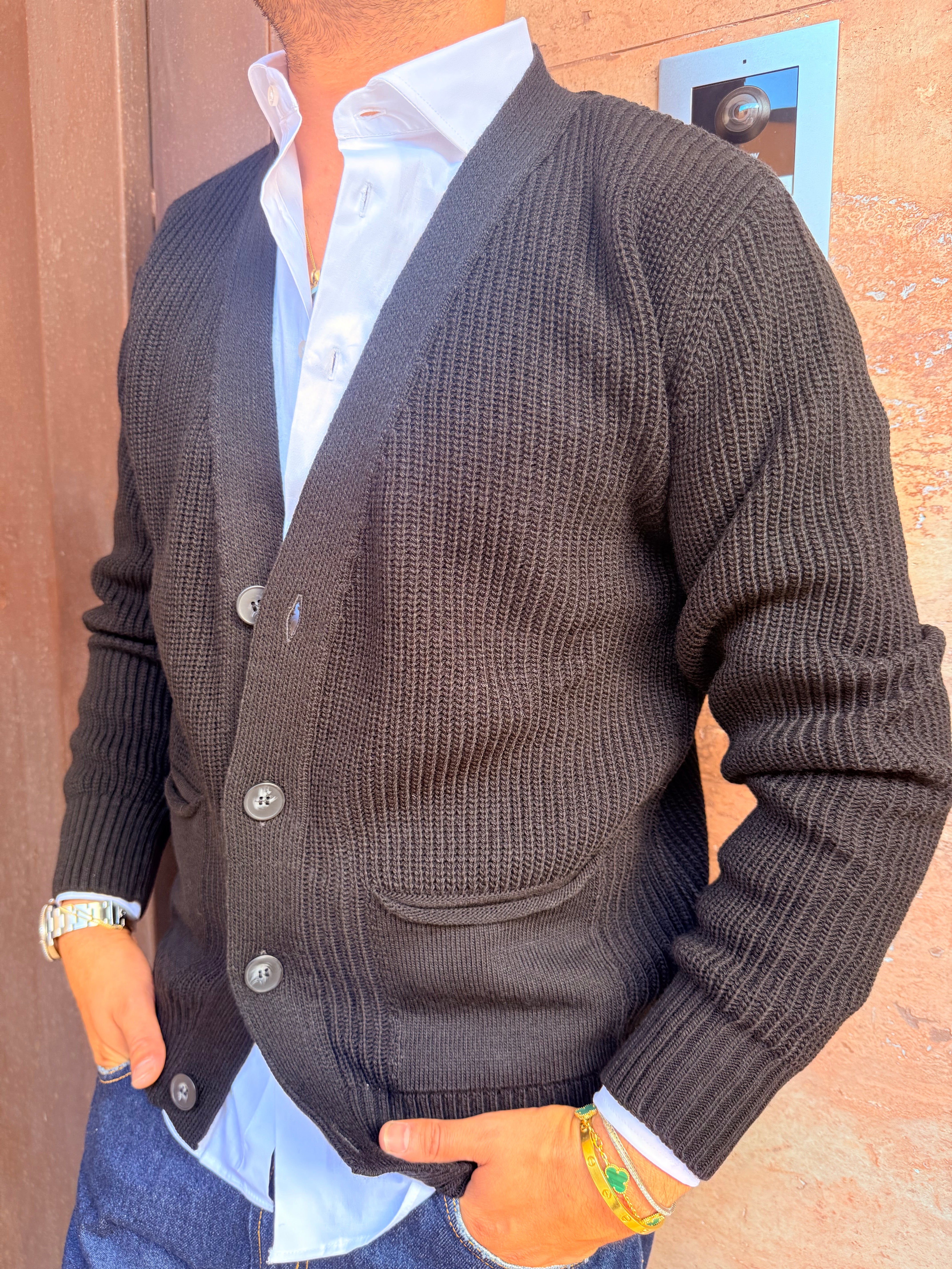 Cardigan in filo con taschini ai lati in filo caldo sto indossando una taglia L sono alto 1,80 m e peso 80 kg