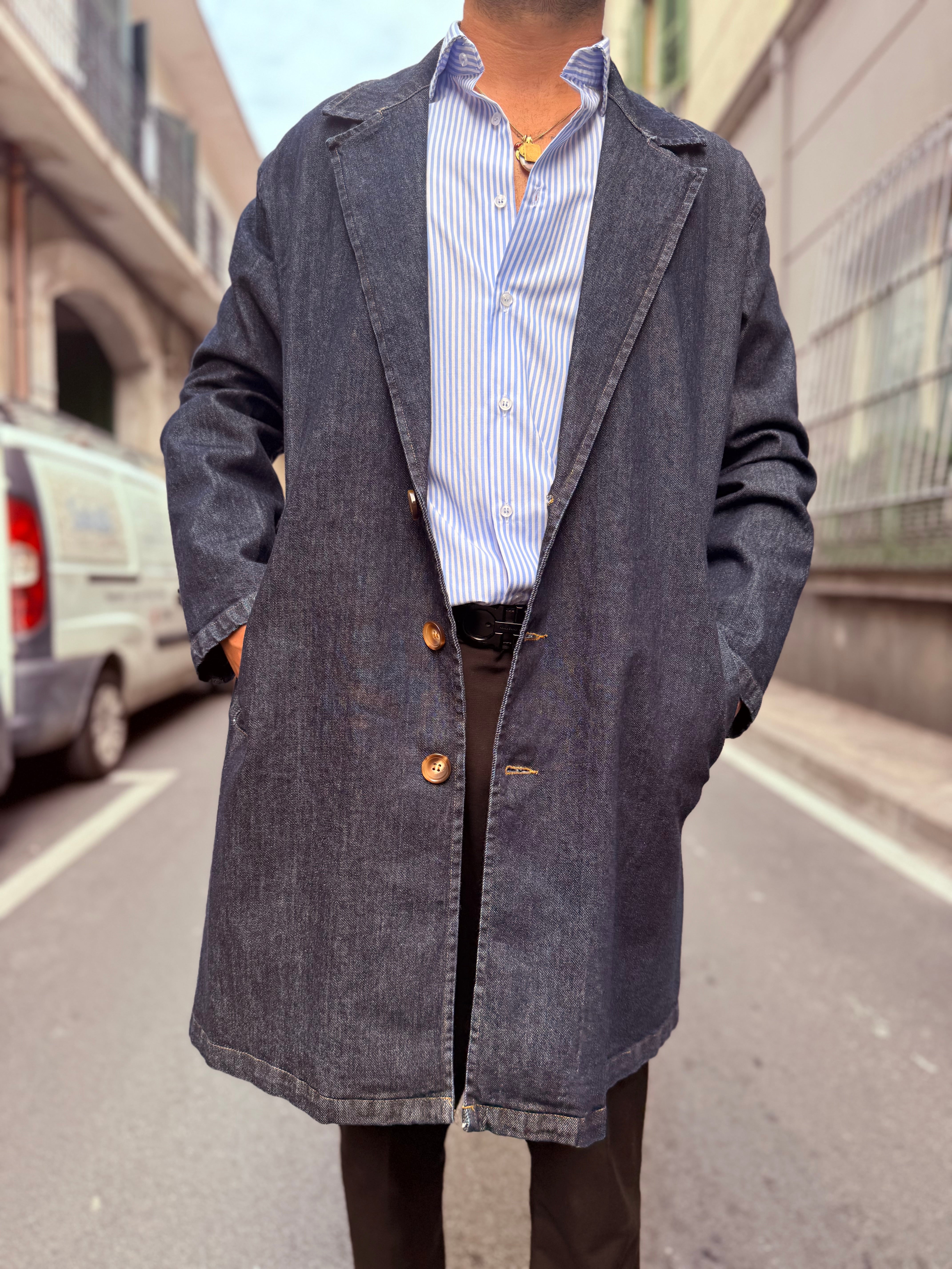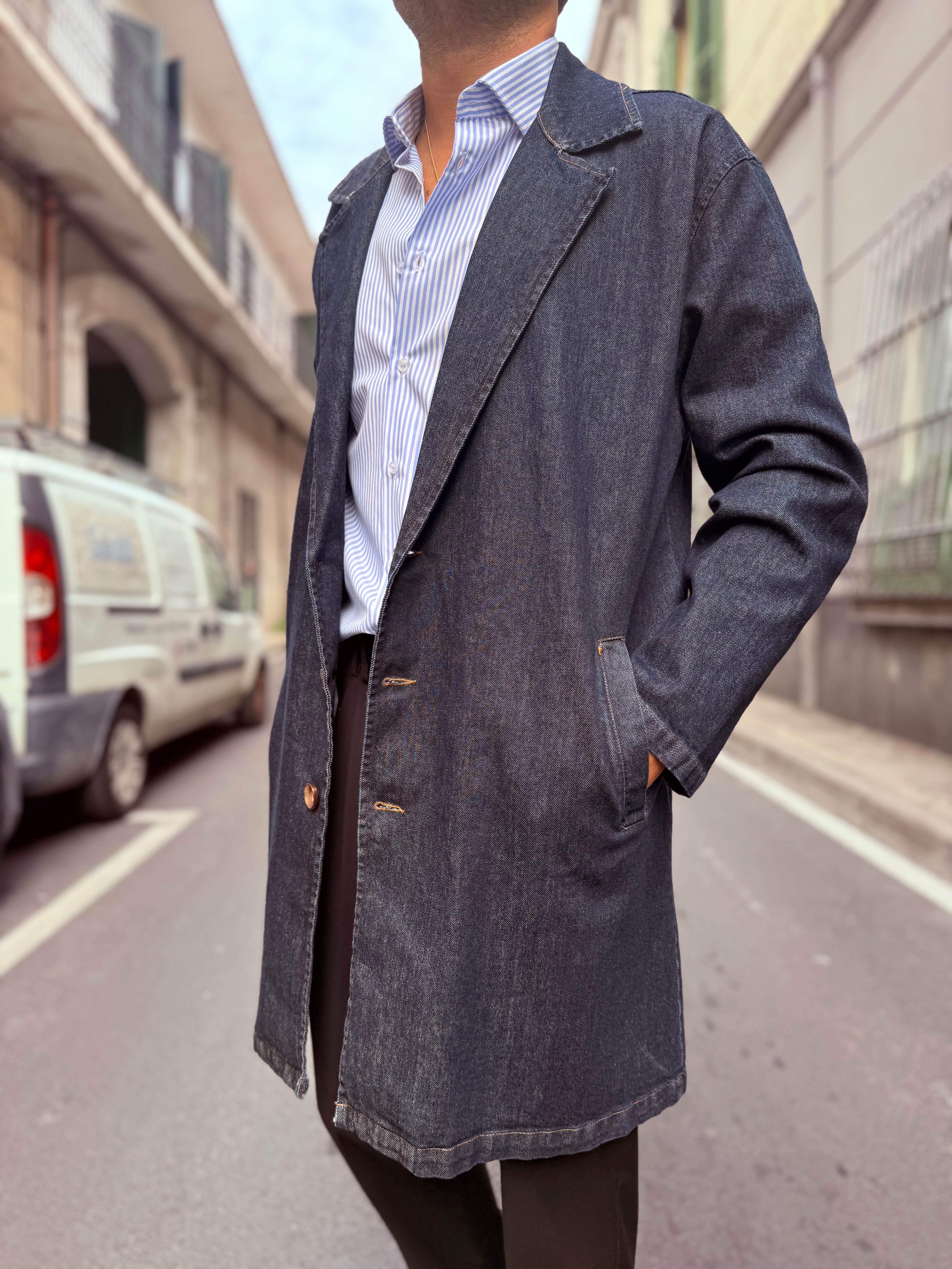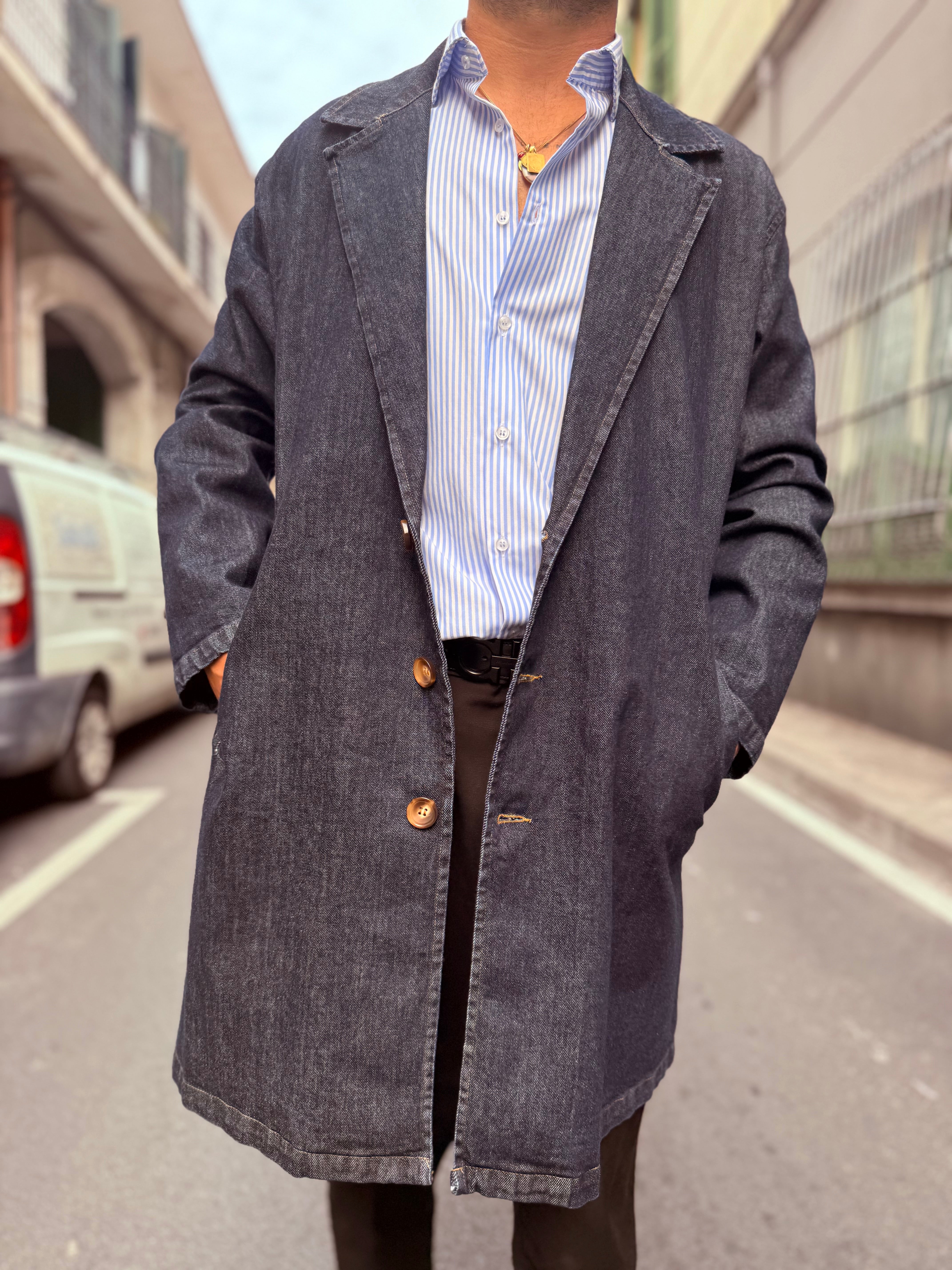 Trench in jeans monopetto tre bottoni in madreperla fit elegante e morbido indosso una taglia L sono alto 1,80 m e peso 80 kg