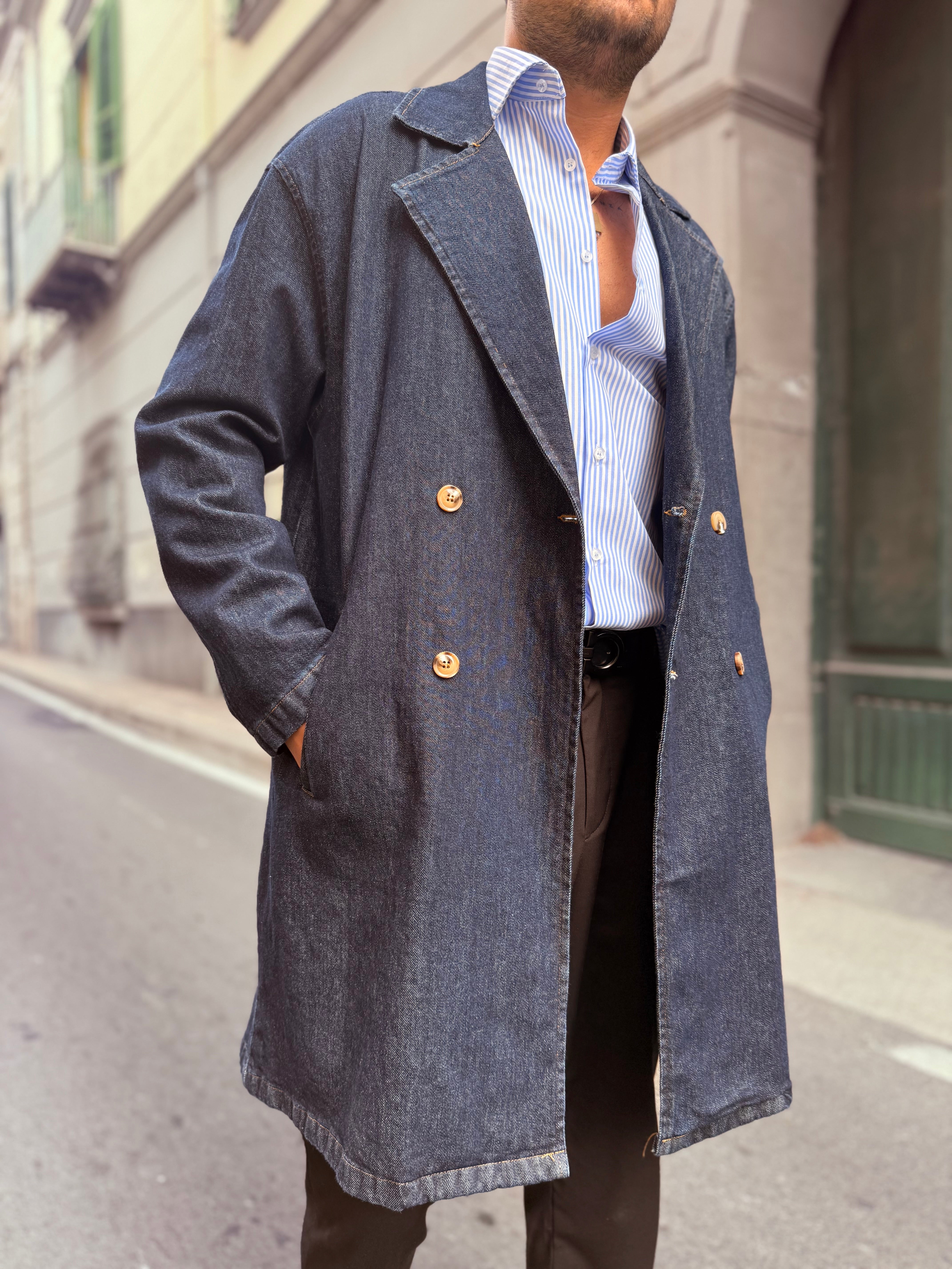 Trench doppiopetto con bottoni in madreperla fitta, elegante e morbido, indossa una taglia L sono alto 1 m 80 e peso 80 kg