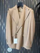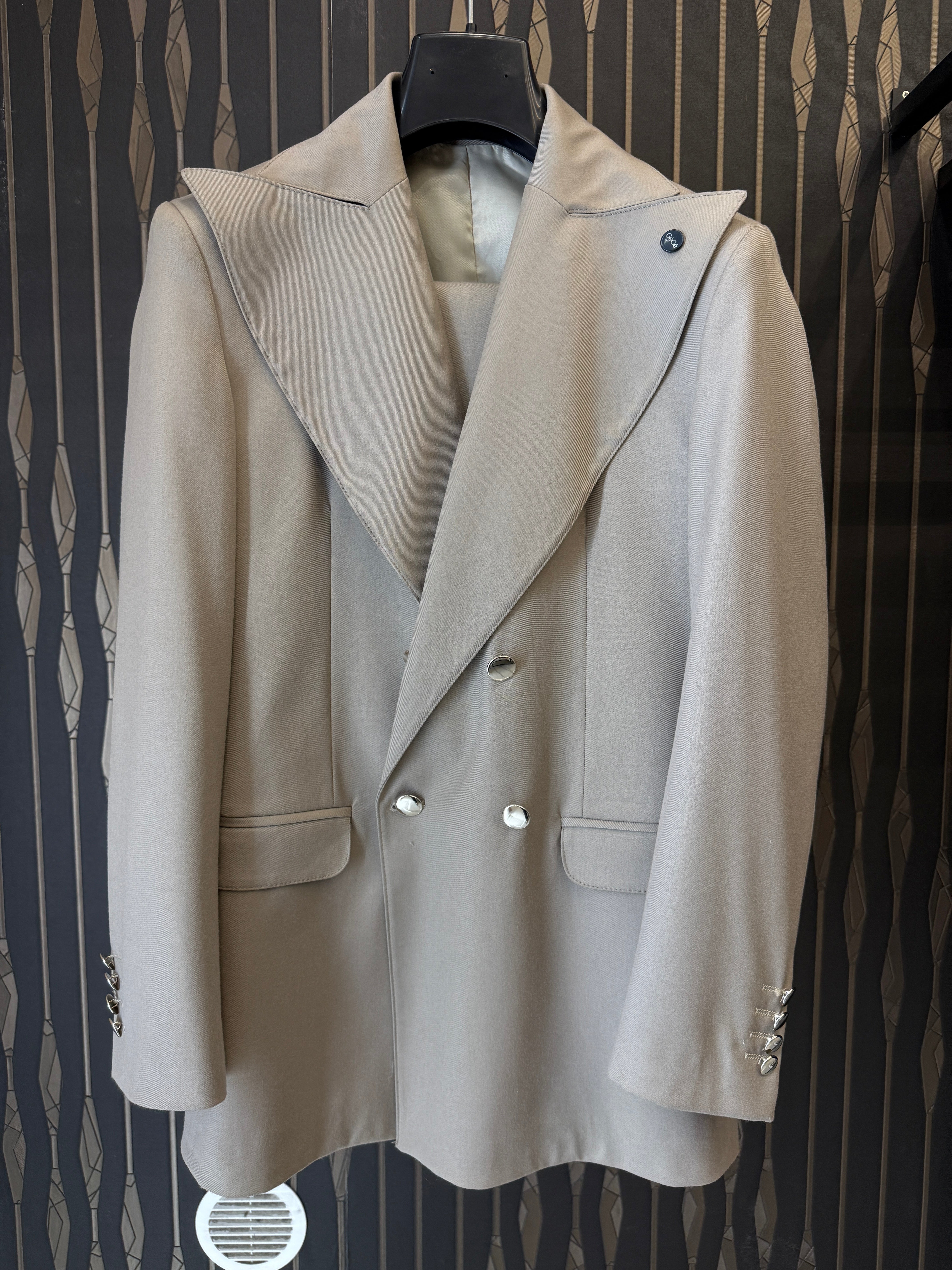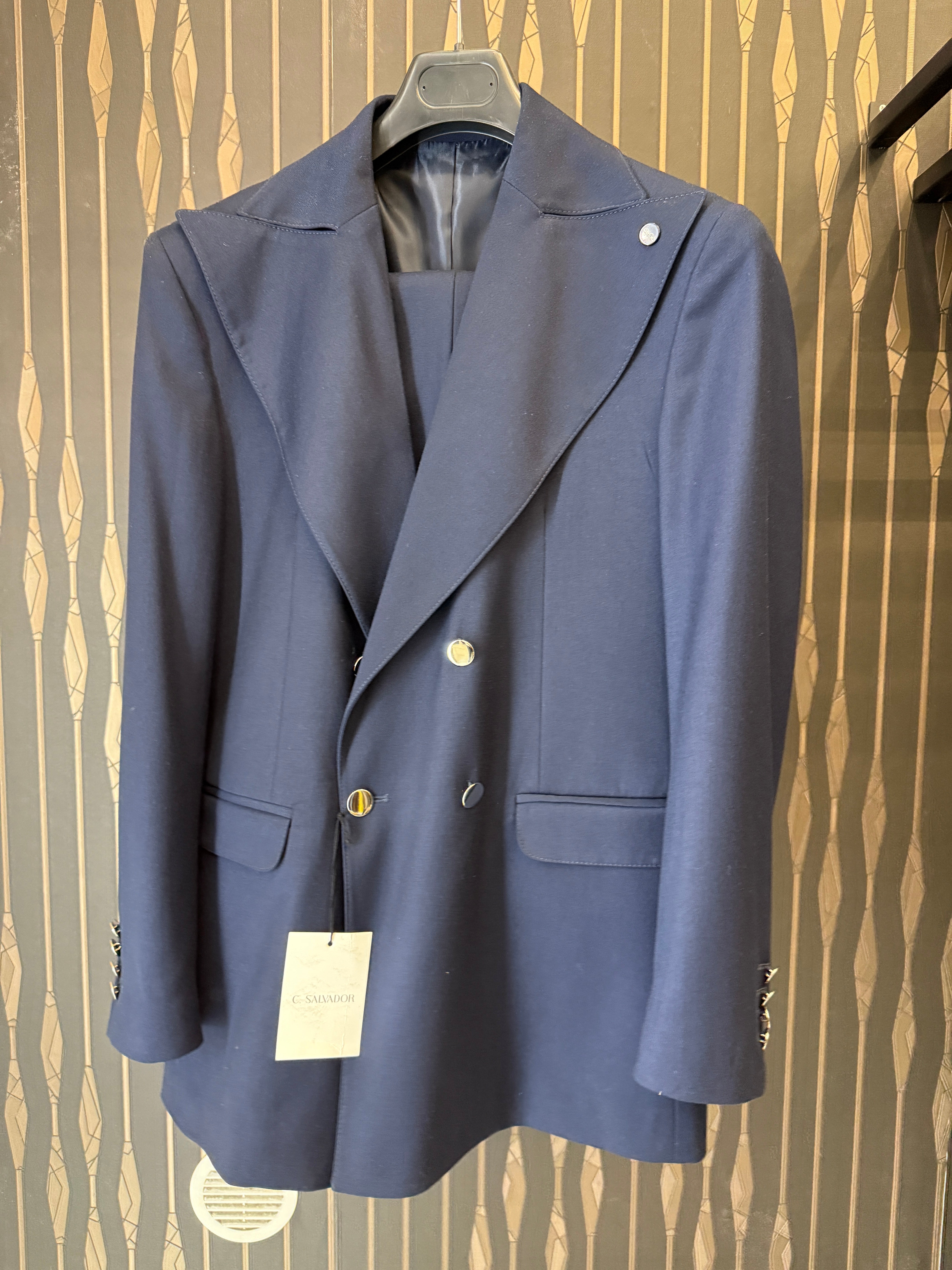 Ultime taglie, abito doppiopetto a palazzo con rever ampio.