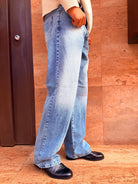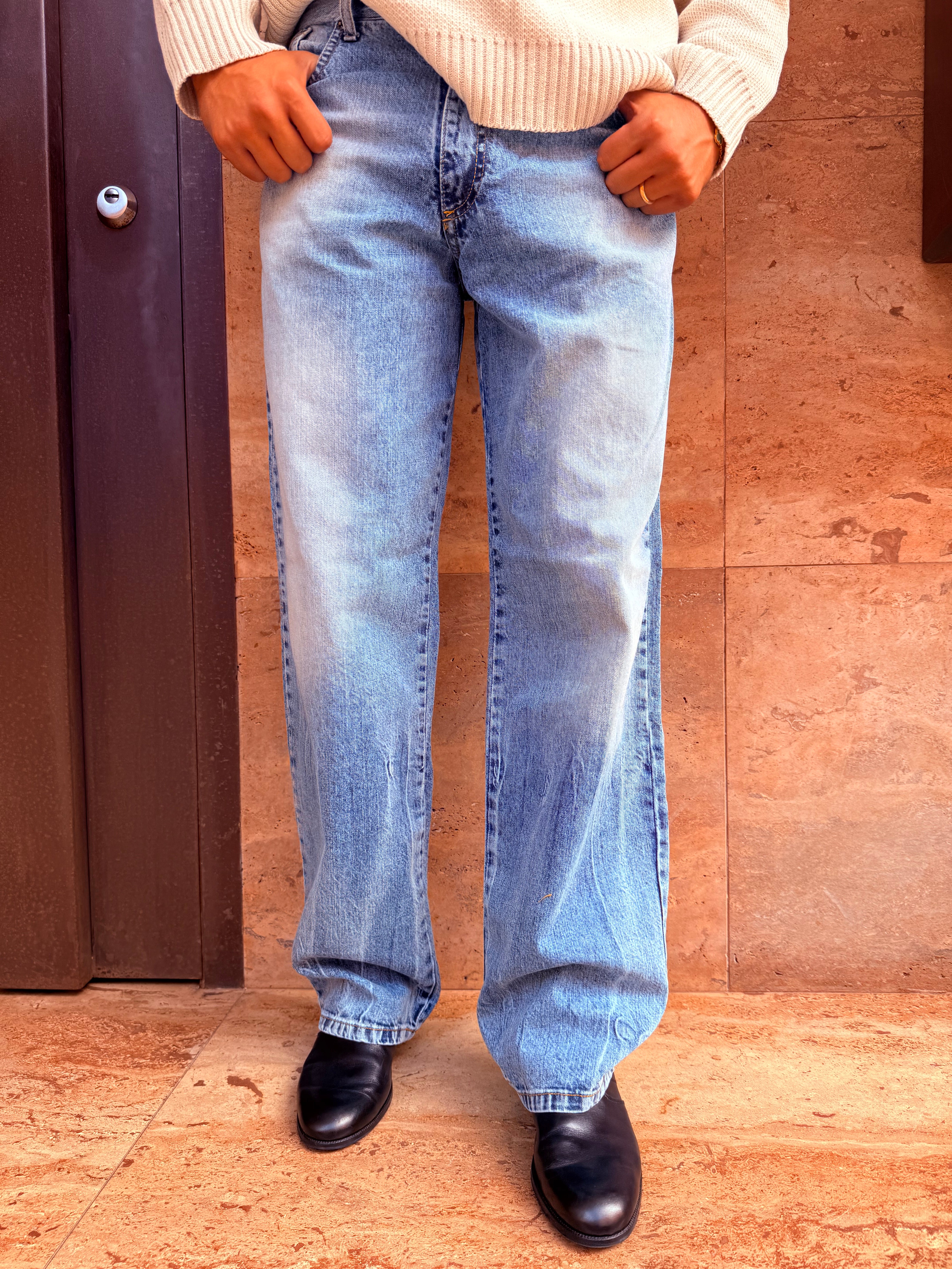 Jeans sfumato gamba larga, sto indossando una taglia L sono alto 1.80 e peso 80 kg