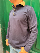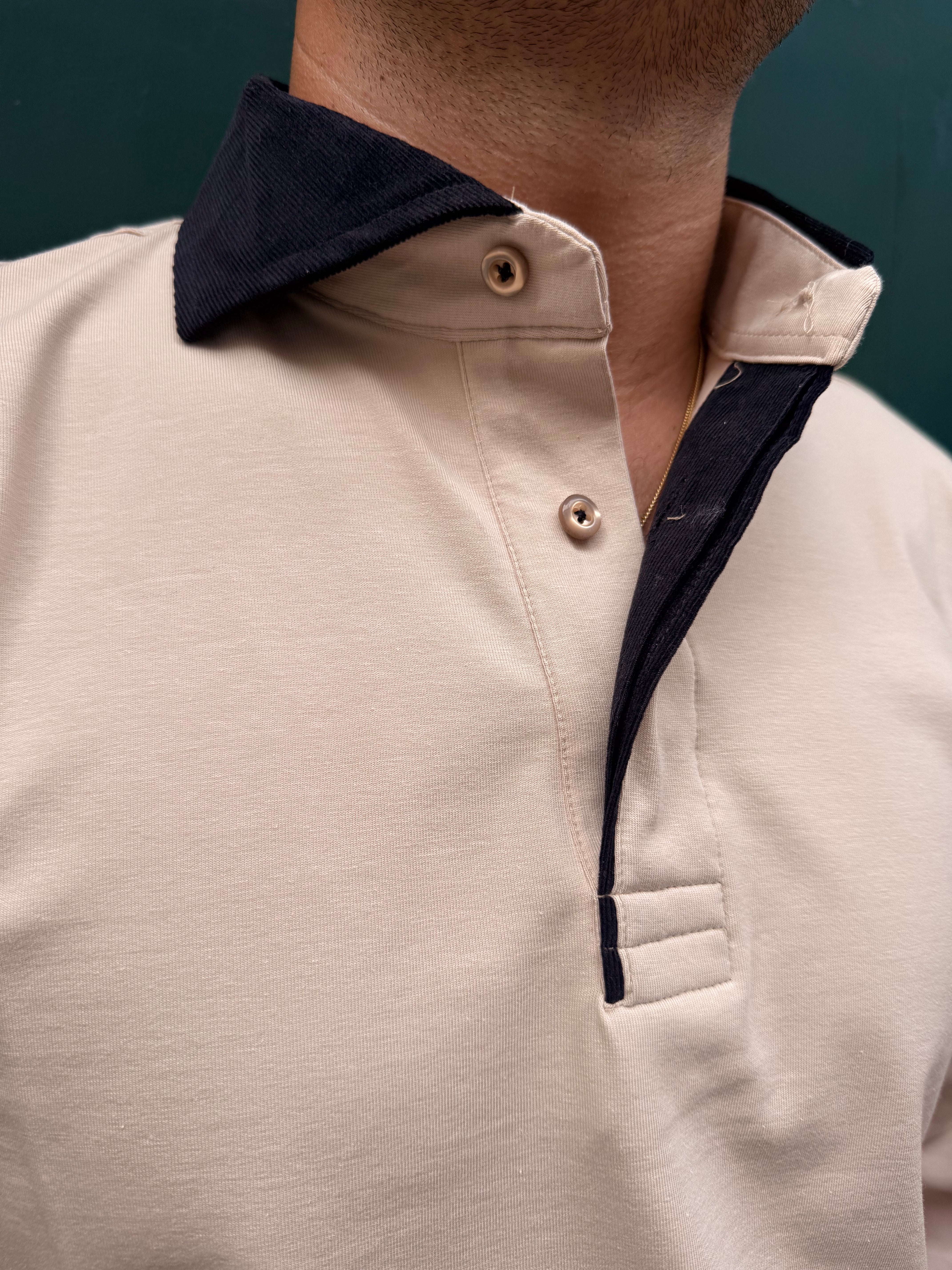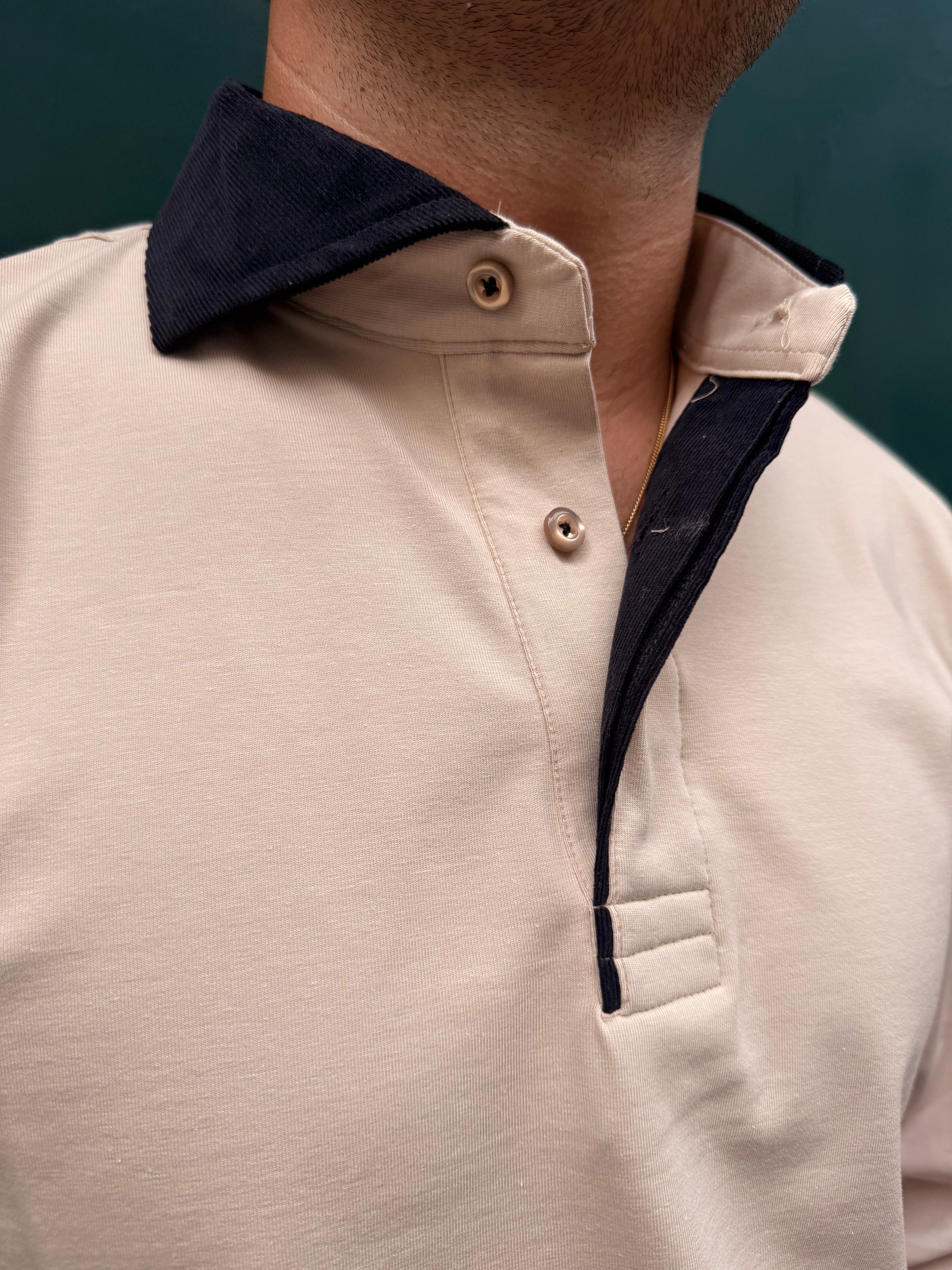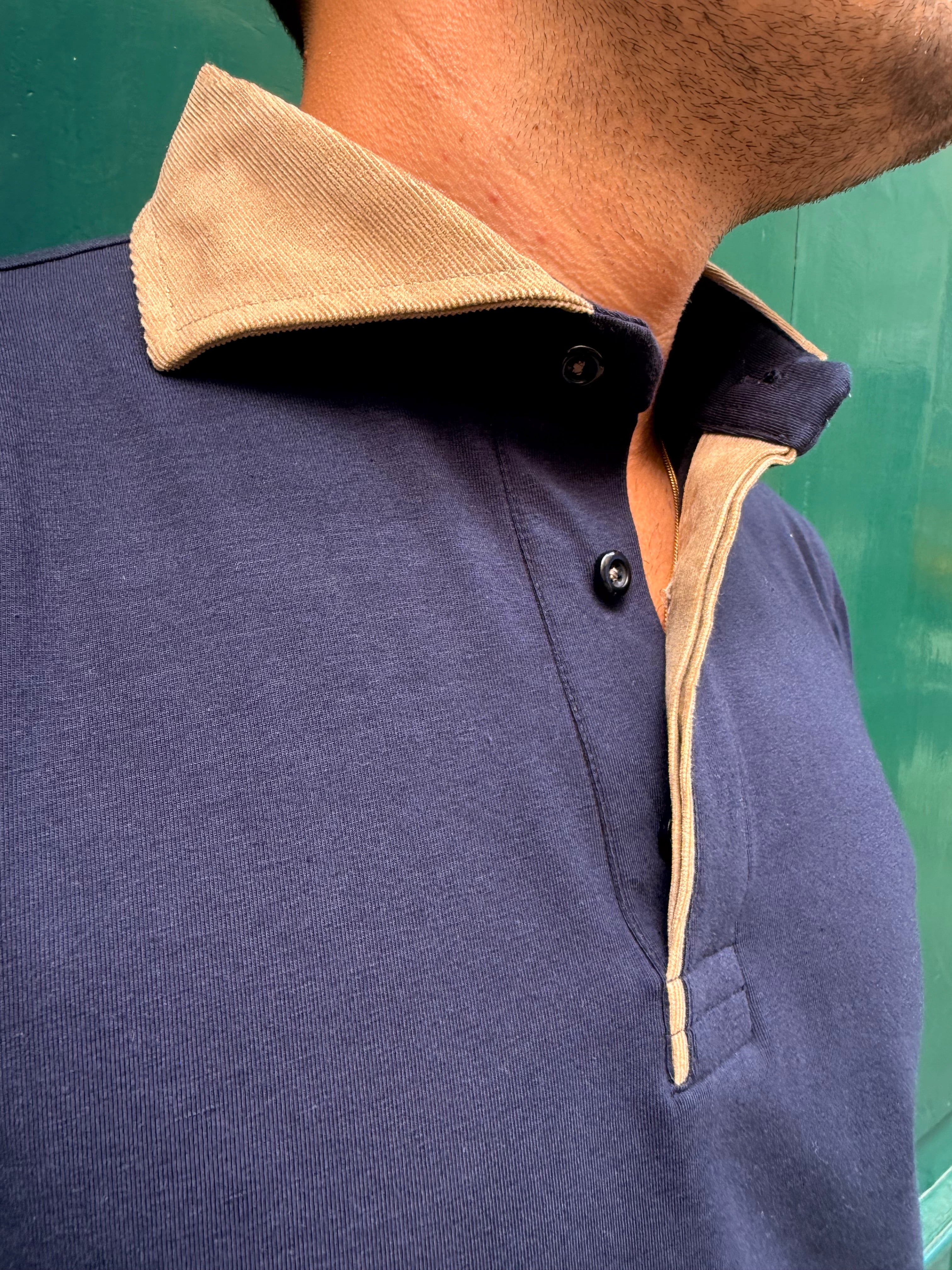 Polo su tessuto punto Milano e collo in velluto, indosso una taglia L sono alto 1.80 e peso 80 kg