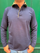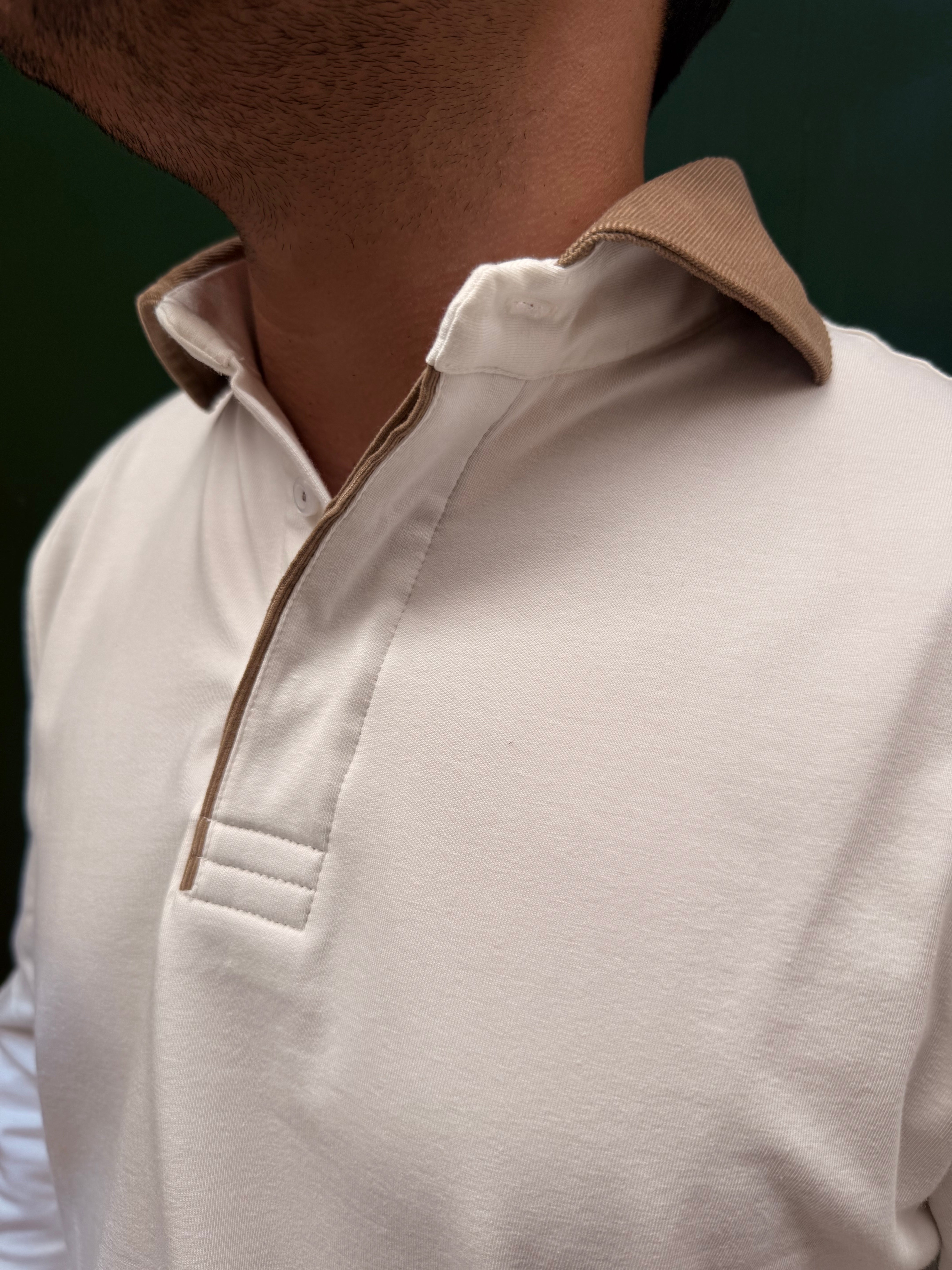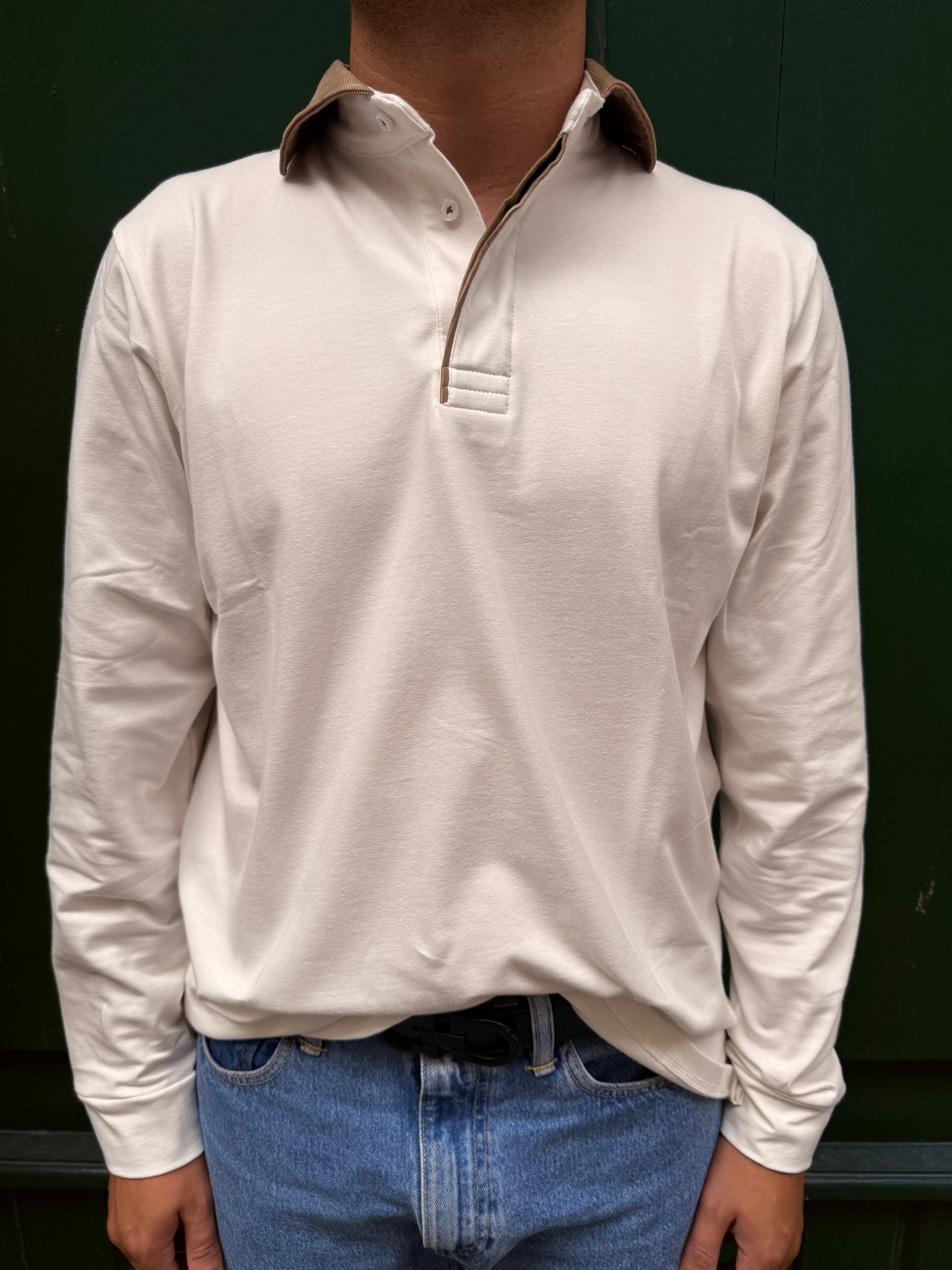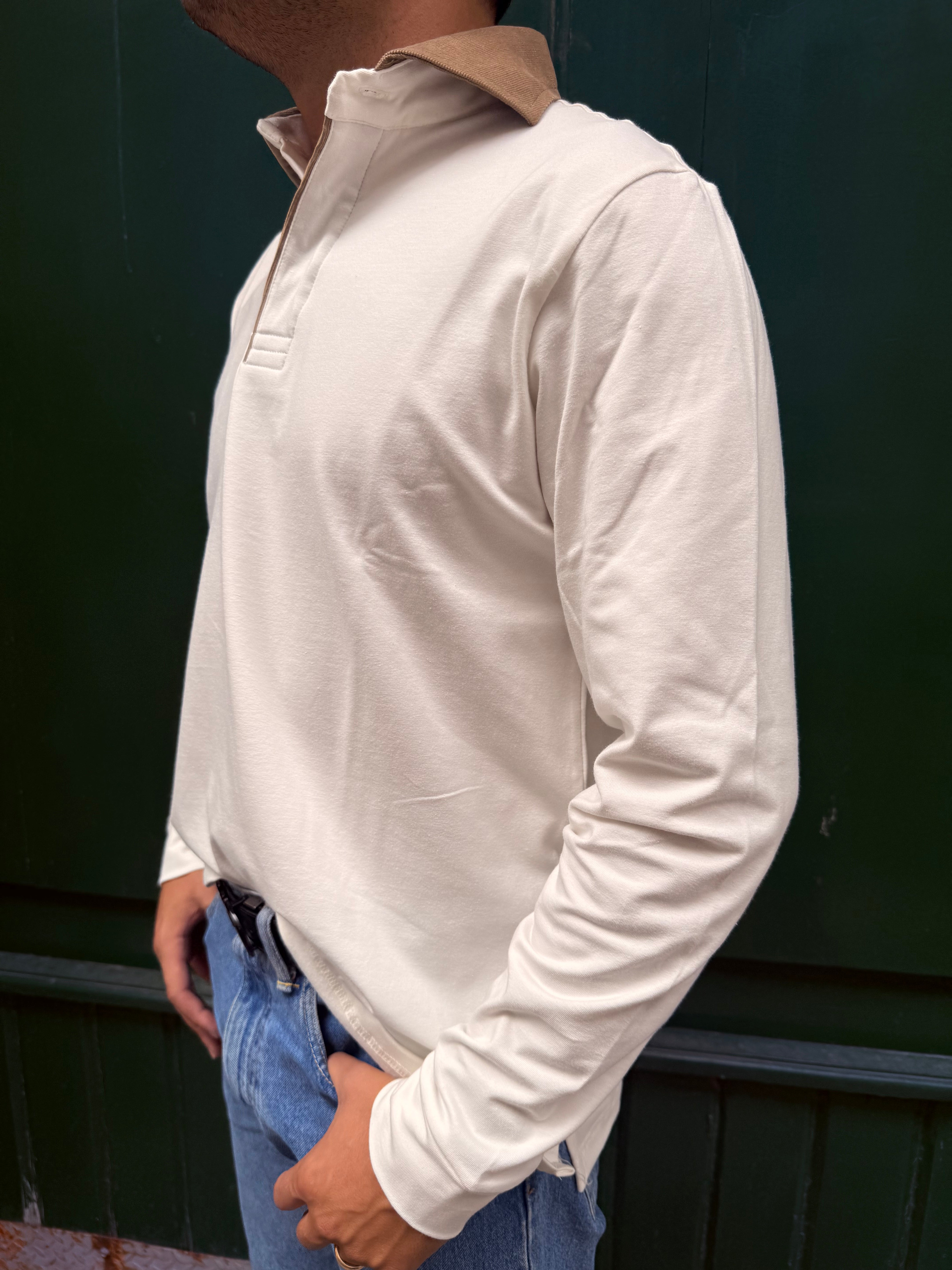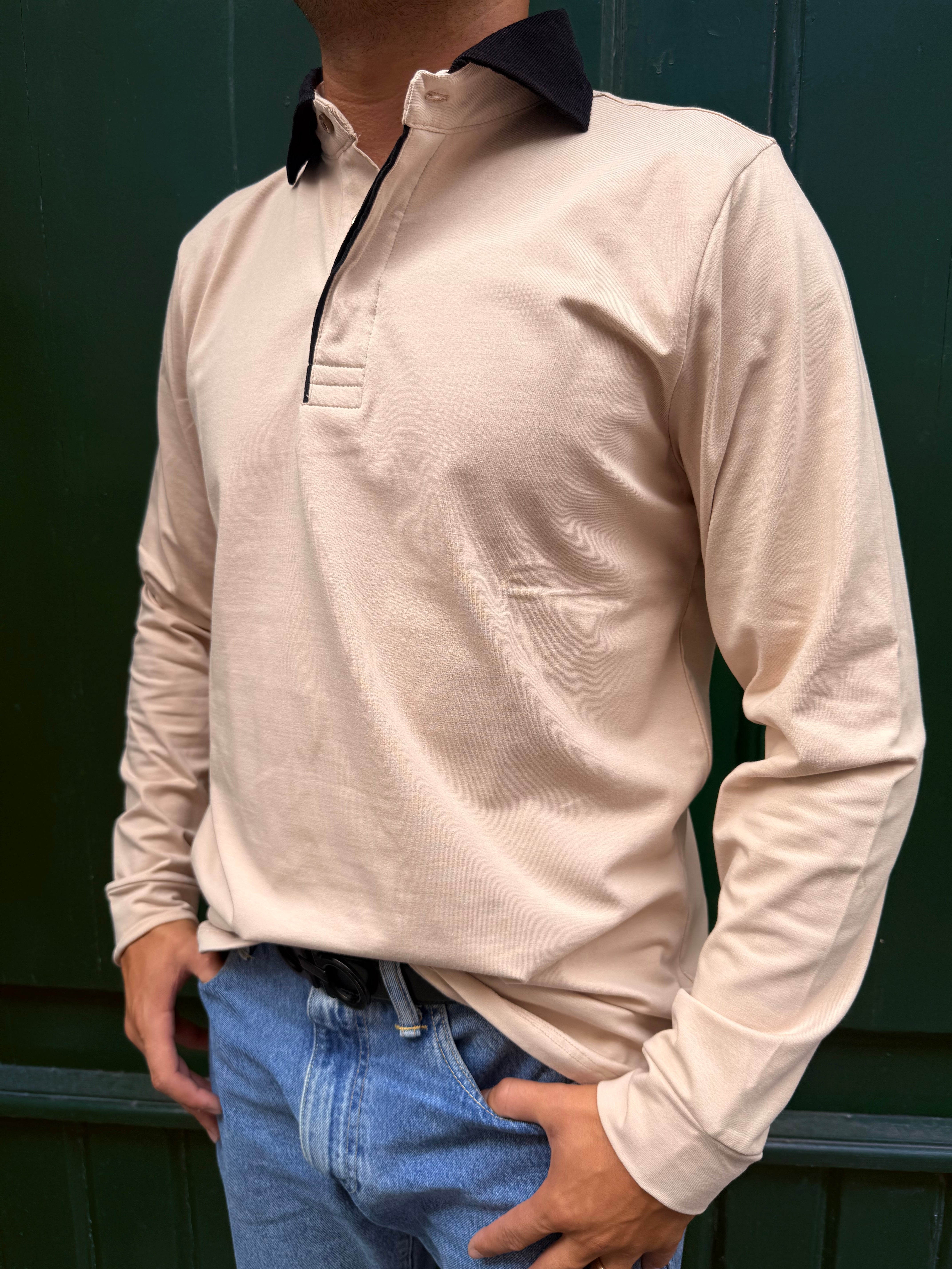 Polo su tessuto punto Milano e collo in velluto, indosso una taglia L sono alto 1.80 e peso 80 kg